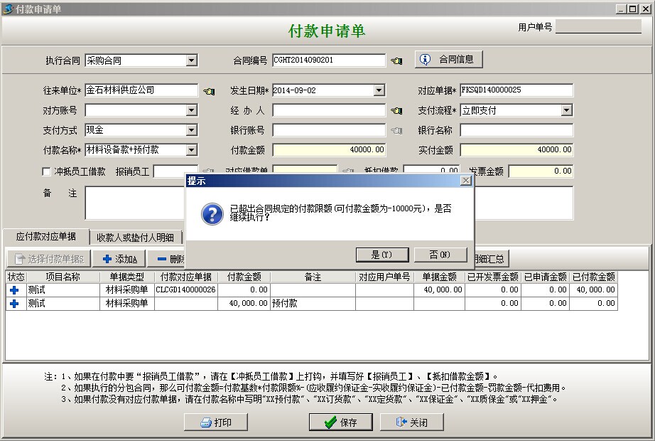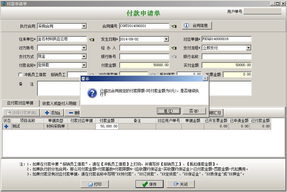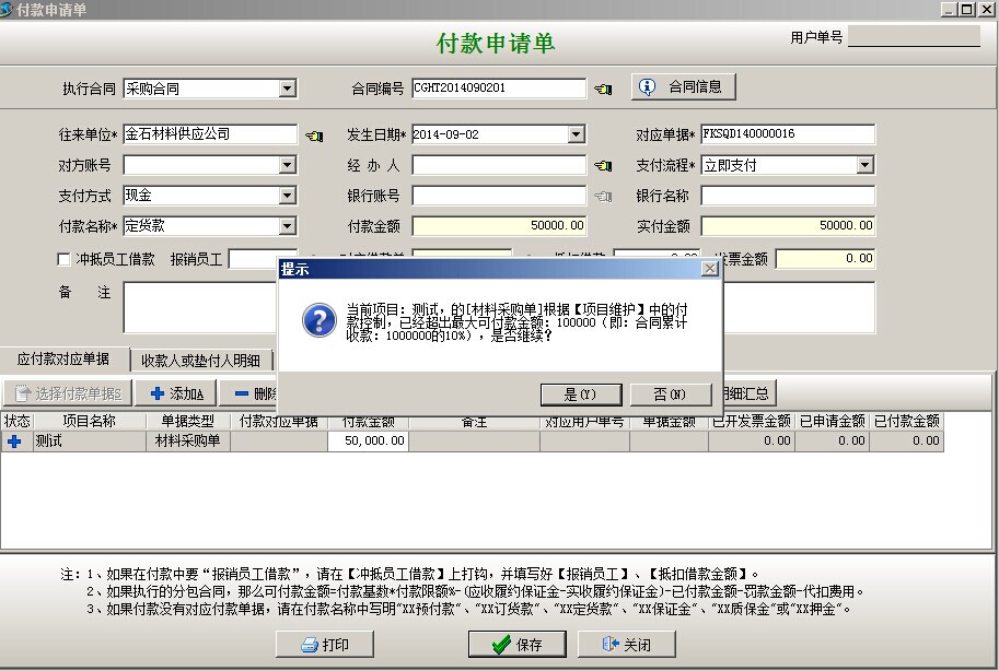 彈出付款申請單,付款名稱自動默認(rèn)材料設(shè)備款+預(yù)付款,付款明細(xì)是自動帶入的,選擇支付方式點保存,會出現(xiàn)提示窗口根據(jù)下面截圖進(jìn)行選擇繼續(xù)。