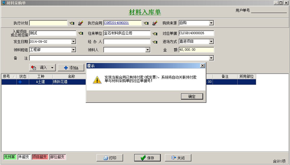 備注:上圖提示為預(yù)防超額付款的合同明細(xì)提示,點確定即可。