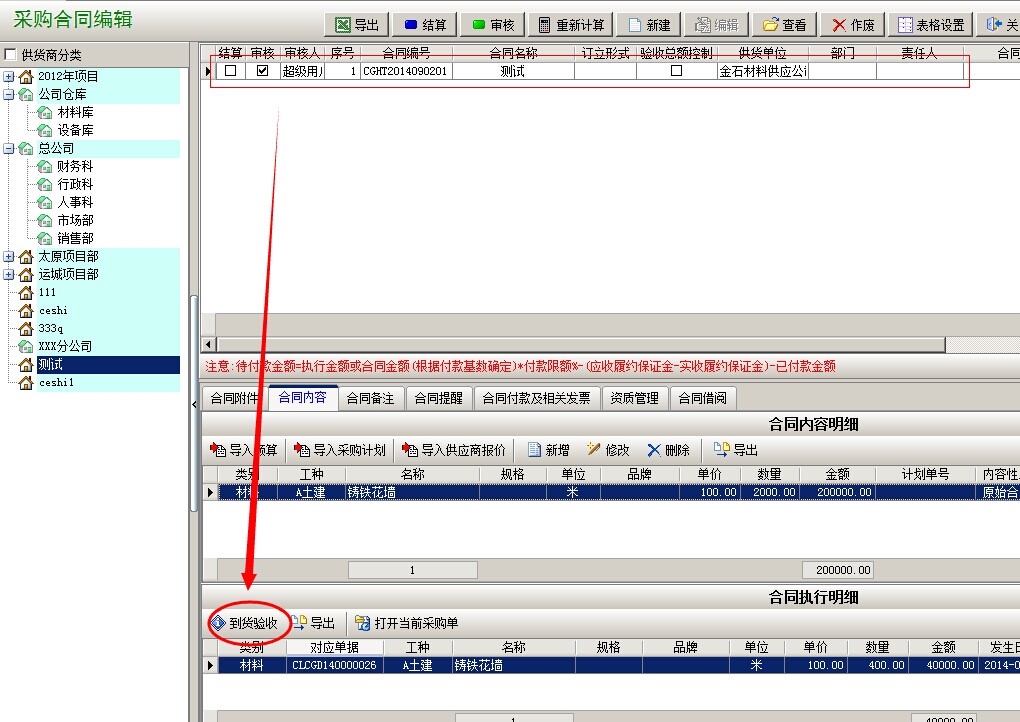打開采購合同內(nèi)容,點擊合同執(zhí)行明細(xì)的[到貨驗收]
