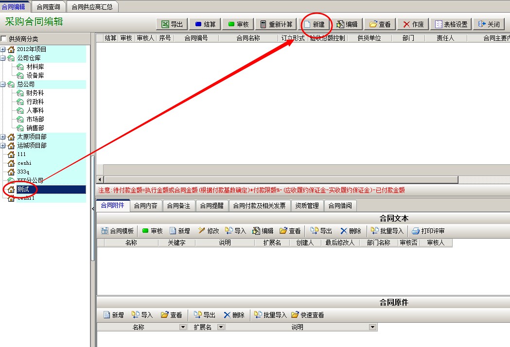 打開采購合同,左側(cè)選擇相應(yīng)的項目,右邊點新建,錄入采購合同相關(guān)信息,保存。