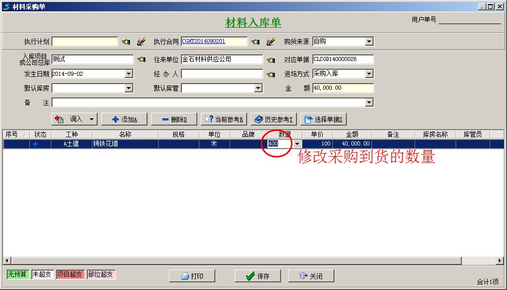 ②執(zhí)行驗收(或驗收一部分):做【材料入庫單】(或叫【材料驗收單】)。