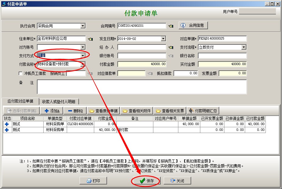 注:上圖所示;付款申請單的兩行明細(xì)為兩個材料采購單,第一行的[付款對應(yīng)單據(jù)]為CLCGD140000026已付款金額40000已經(jīng)等于單據(jù)金額(表示該采購單已經(jīng)付完,是通過上一個付款單自動對應(yīng)上的付款數(shù)),所以付款金額為0,第二行的[付款對應(yīng)單據(jù)]為空,表示本項支付的款項為預(yù)付款),上面的付款名稱為材料設(shè)備款+預(yù)付款;