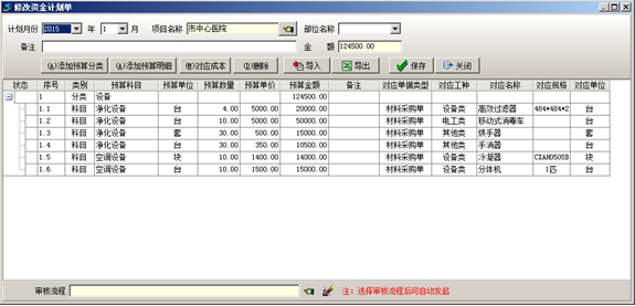 例如下圖所示:預算分類為設備,明細科目為凈化設備,對應的名稱可以為高效過濾器、移動式消毒車、烘手器等。