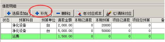 在請款過程中, 如果出現預算以為的請款,如:運費、裝卸費等,可以利用補充按鈕來進行補充。
