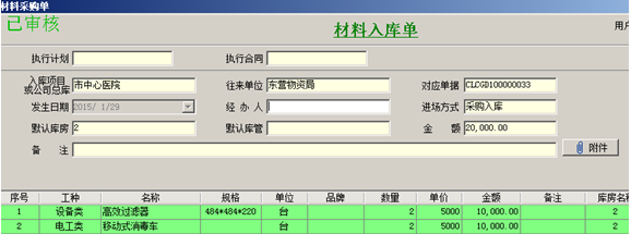 以上面的借款為例,我們來做一張付款申請單,首先是做業務單據,采購相應設備(這里設備不是公司的固定資產,而是需要給客戶安裝的設備,所以是歸到材料類中)應該做采購入庫單(材料采購單)。
