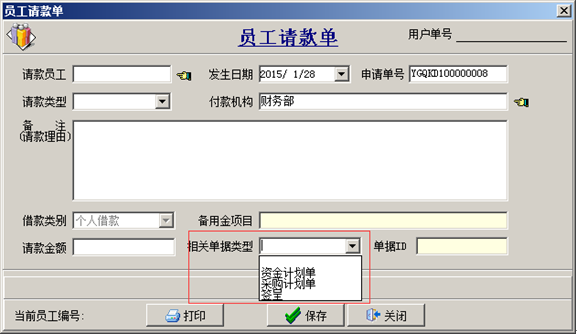 這時的【員工請款單】較為簡單,只提供了備注、與附件功能,給審核該單據的管理人員造成了一定的難度。為了解決這一問題軟件改進了【員工請款單】給請款單中增加了三個來源:【資金計劃單】、【采購計劃單】、【簽呈】,以方便在員工請款審核中,查看請款理由是否合理。其中【采購計劃單】和【簽呈】是軟件中一直存在的模塊,直接關聯的計劃單號和簽呈單ID。