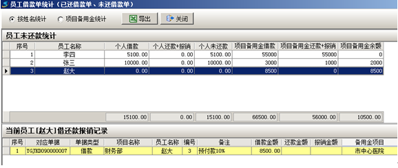 請款審核完成后,接下來是財務人員把錢支付給請款人然后執行【員工請款單】生成【員工借款單】。下圖所示:生成【員工借款單】后在員工借款單統計中可以看到,目前借款人趙大,項目備用金借款為8500元。