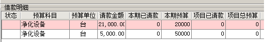 我們選擇其中兩項,高效過濾器和移動式消毒車,其中高效過濾器預算金額為20000元、移動式消毒車預算費用為50000元,當我們的請款金額小于預算金額時候,顯示為正常的白色。