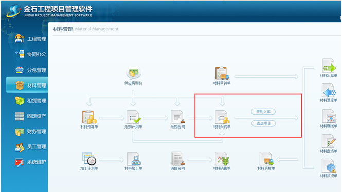3項目上報采購計劃,審核通過之后簽訂采購合同,然后執行采購入庫 (這種工程項目材料采購流程適合項目上需要有采購環節的采購) 如圖: