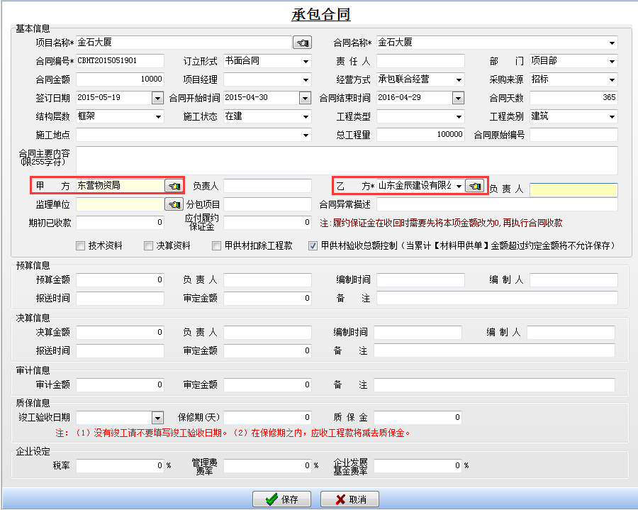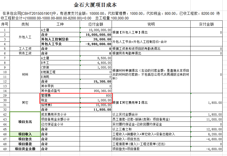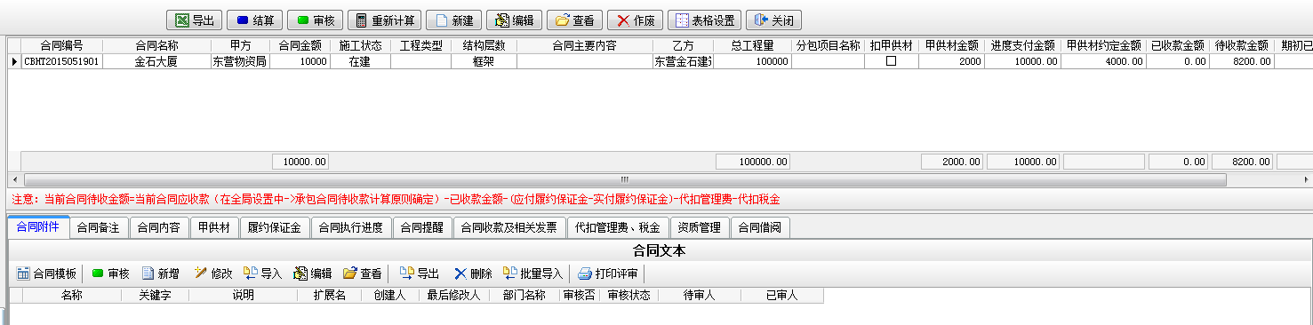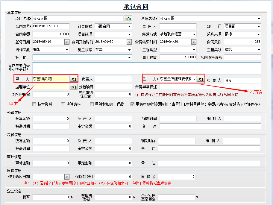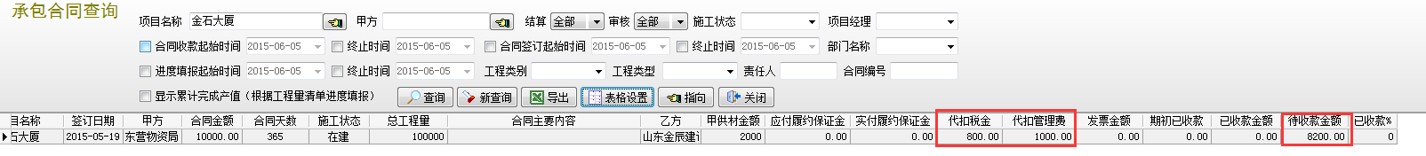 在工程項目資質掛靠管理中因為借用乙方B的資質,需要扣除管理費,如果需要乙方B代開發票還需要扣除稅金。在承包合同中[代扣管理費稅金]模塊下操作,如下圖: