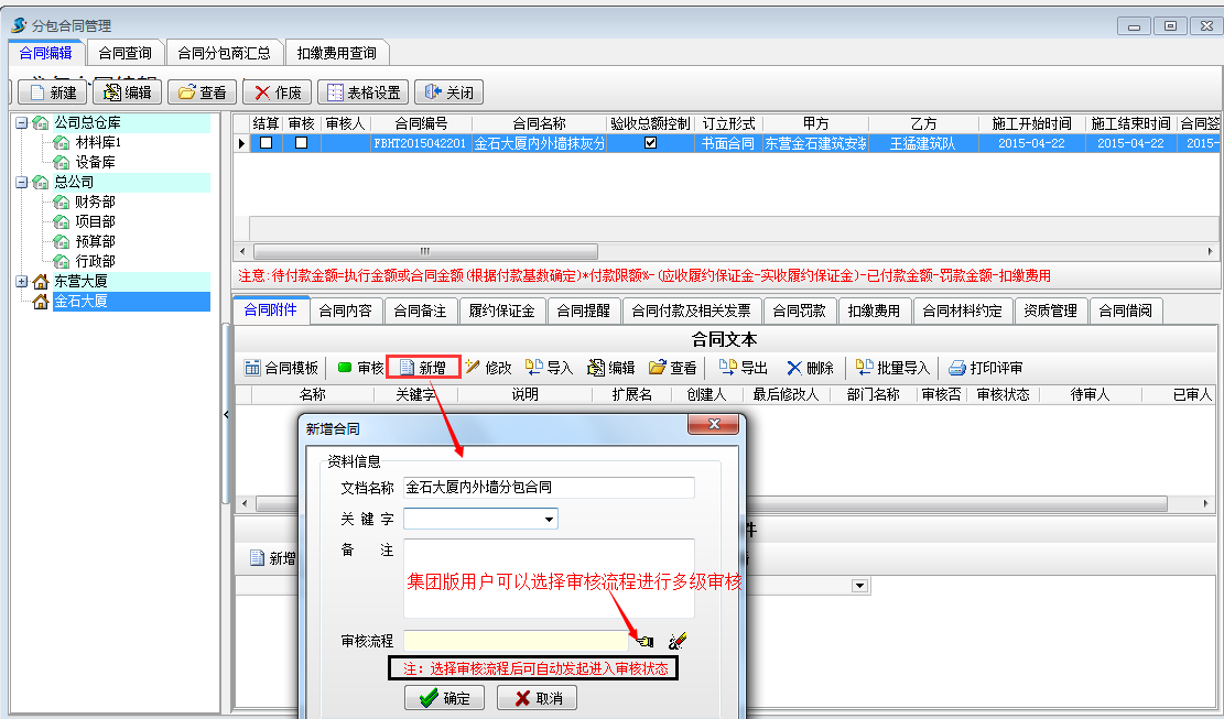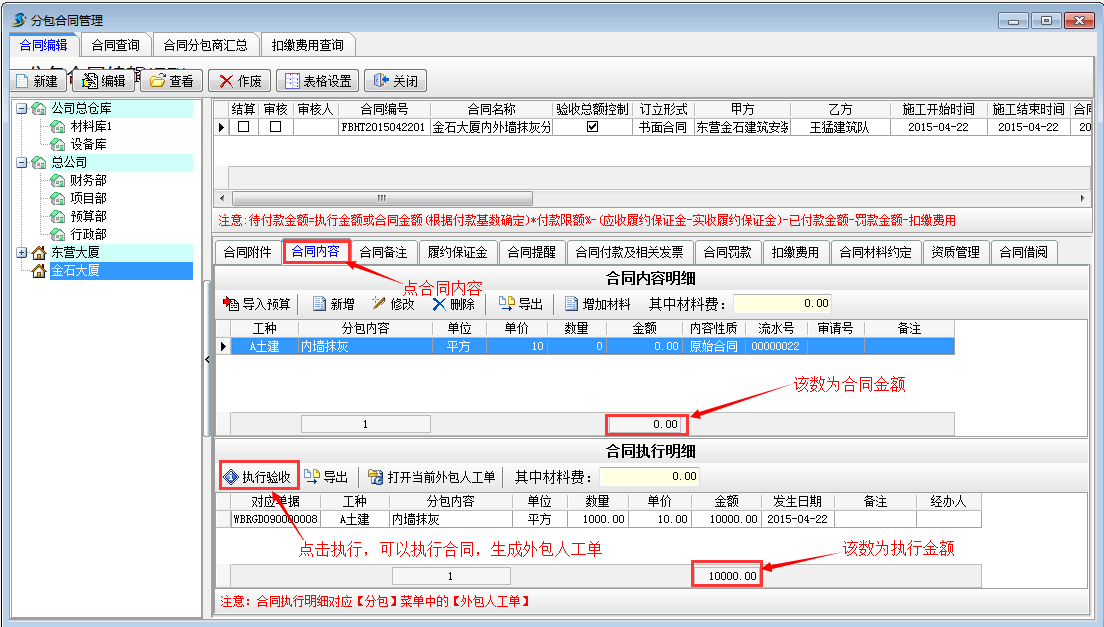 經年底現場審核,確定完成內墻4000平米,外墻2000平米,向施工隊付分包款,并扣除生活費。我們在合同內容處選擇執行驗收或者直接做外包人工單,外包人工單可進行多級審核.