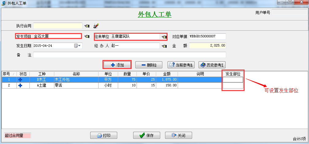該模塊用于管理臨時工人的工資或者沒有合同的外包人工。工程項目管理軟件網絡標準版用戶如果想管理勞務工資也可以在這里錄入,網絡集團版有專門的勞務模塊。錄入時直接做外包人工單即可。如圖: