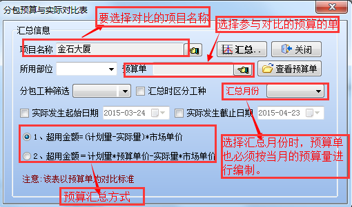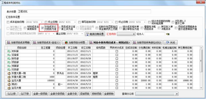 (3)【分包預算與實際對比表】是項目的分包預算單與實際發生的分包進行量價的對比。對比窗口界面設置如下
