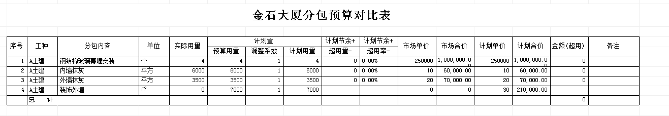 備注:調整系統說明:在實際的工程量投標中,某些施工企業為了中標而做低預算量,還有其它的原因如:一些分包根據以往的施工經驗總會有一定的偏差。這里用調整系數是為了將最終要參與比較的【計劃用量】、【計劃用量】調整到接近于預期最真實的值。