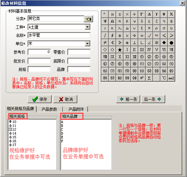 點擊“新增”或“修改”的按鈕來編輯材料信息,在進行材料基本信息編輯時,可進行相關規格以及相關品牌的維護,對應的規格及品牌維護完成在系統的業務單據中可選,這樣可避免同種材料在系統中生成多條記錄的麻煩。如圖: