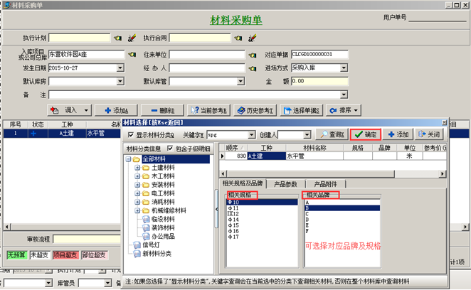 (1)、相關規格和品牌設置好后,在做材料相關單據時系統會自動列出以供選擇。