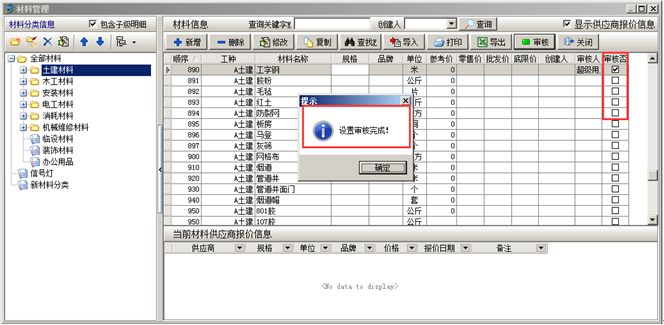 在金石工程管理軟件中可對添加的“材料信息”進行審核(此功能為可選功能)。如圖:
