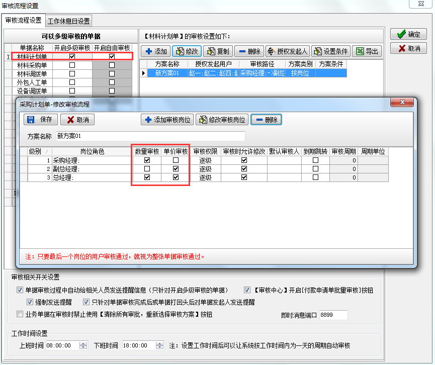 具體設(shè)置方法:材料計劃單審核設(shè)置為:需要審核。材料采購流程又為:根據(jù)采購計劃單或者部分材料根據(jù)采購計劃單