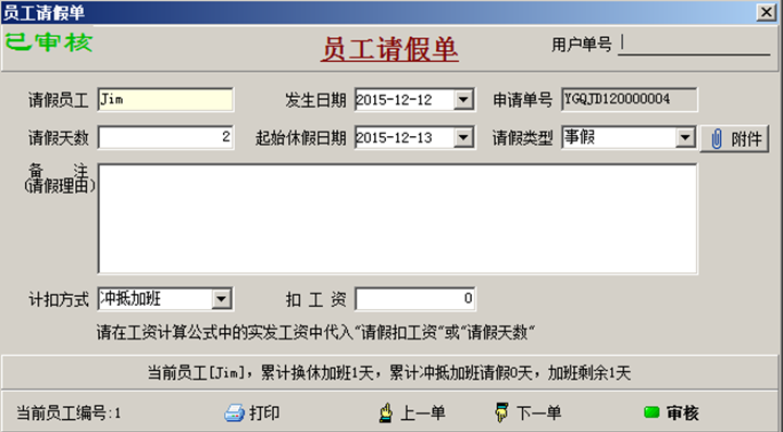注:“扣工資”金額這里不用填寫(xiě),因?yàn)樵诒纠小竟べY項(xiàng)目定義】中“請(qǐng)假扣工資”要通過(guò)公式來(lái)得出。如果,“請(qǐng)假扣工資”不根據(jù)【工資項(xiàng)目定義】公式計(jì)算,每張請(qǐng)假單單獨(dú)體現(xiàn)的話(huà),這里需要填寫(xiě)好“扣工資”金額。