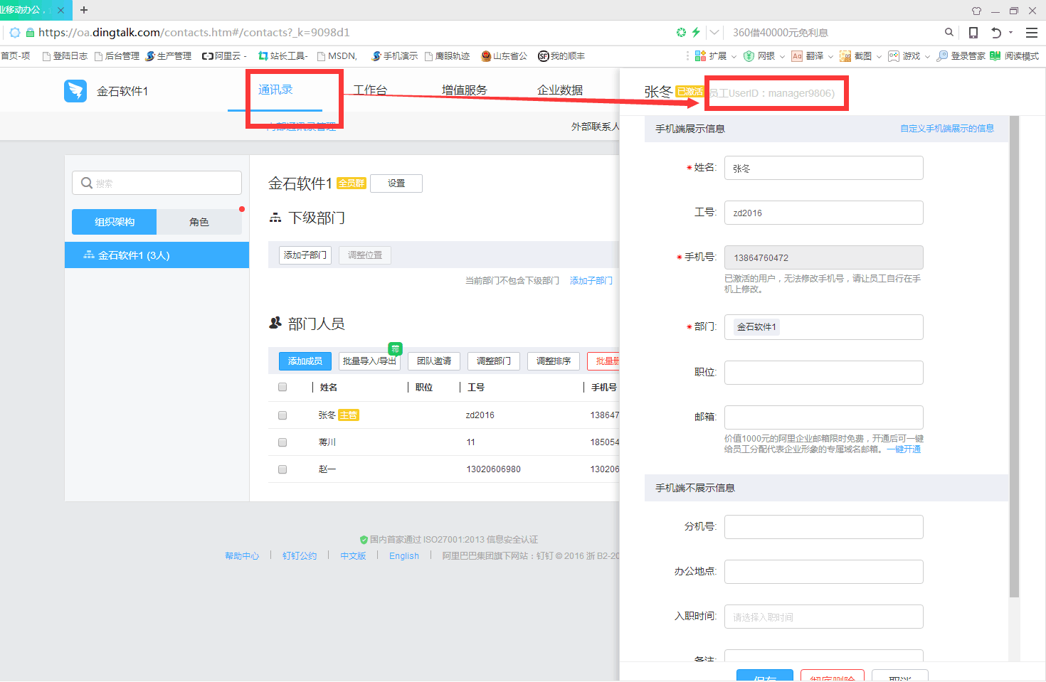 ⑶ 在金石軟件【系統維護】-【用戶管理權限設置】中設置每個使用用戶的釘釘賬號為釘釘管理后臺中通訊錄成員的員工UserlD。