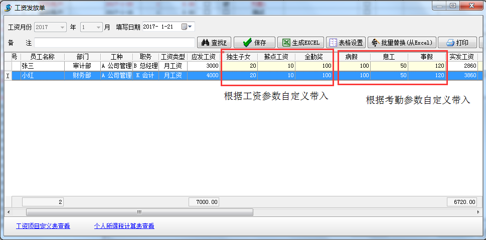 五、 生成工資表,系統根據(上圖)編輯的公式自動計算出實發工資
