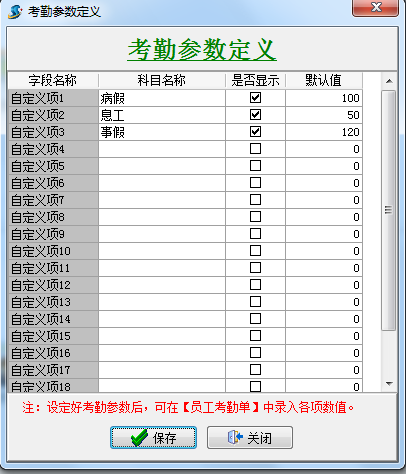 在考勤表中我們已經做了考勤參數,但往往因一些公司考勤方式比較特殊導致不夠用,現增加了考勤自定義功能用法如下: