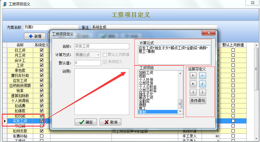 雙擊選擇實發工資,通過工資項目和運算符定義編輯計算公式(運算字符一定要用鼠標點擊下圖運算符定義選擇,不能用鍵盤直接輸入)