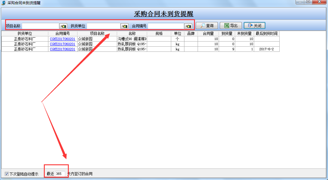 可根據項目名稱、供貨單位、合同編號,按照時間檢索一定時間段內的合同未到貨信息 如下圖: