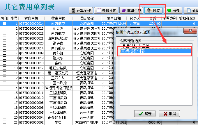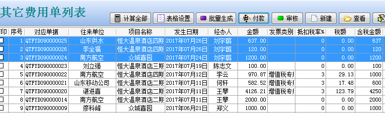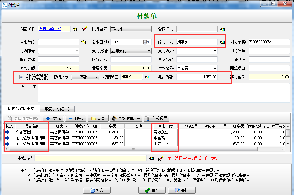 在工程項(xiàng)目管理軟件中如果某個員工在多個項(xiàng)目任職,又有多個往來單位都產(chǎn)生業(yè)務(wù)往來,都要進(jìn)行報銷付款(沒有對應(yīng)合同的前提下),按住ctrl鍵選擇待付款的單據(jù)(需單據(jù)的經(jīng)辦人是相同的)