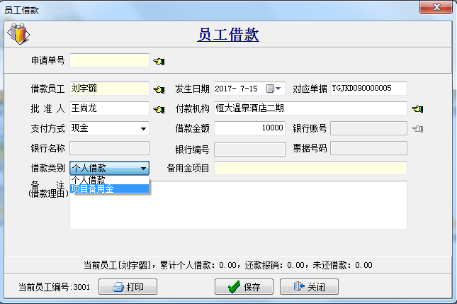 備注:員工借款分為個人借款和項(xiàng)目備用金,其中選擇項(xiàng)目備用金主要用于大額的采購,是專款專用的,不能用于其他項(xiàng)目
