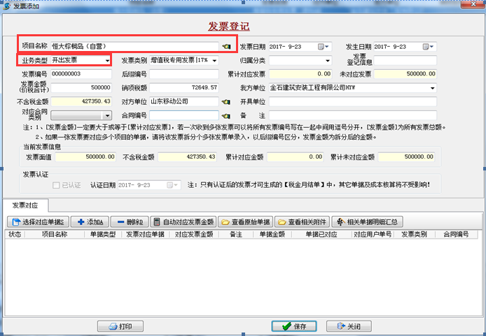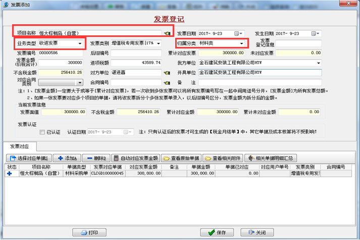 ②進項稅對應材料票:菜單欄【財務管理】→【發票管理】“收進發票”歸屬分類選材料票(在一個項目中應控制材料票、勞務票等所占的比例,此功能用于計算掛靠單位發票歸屬所占百分比)