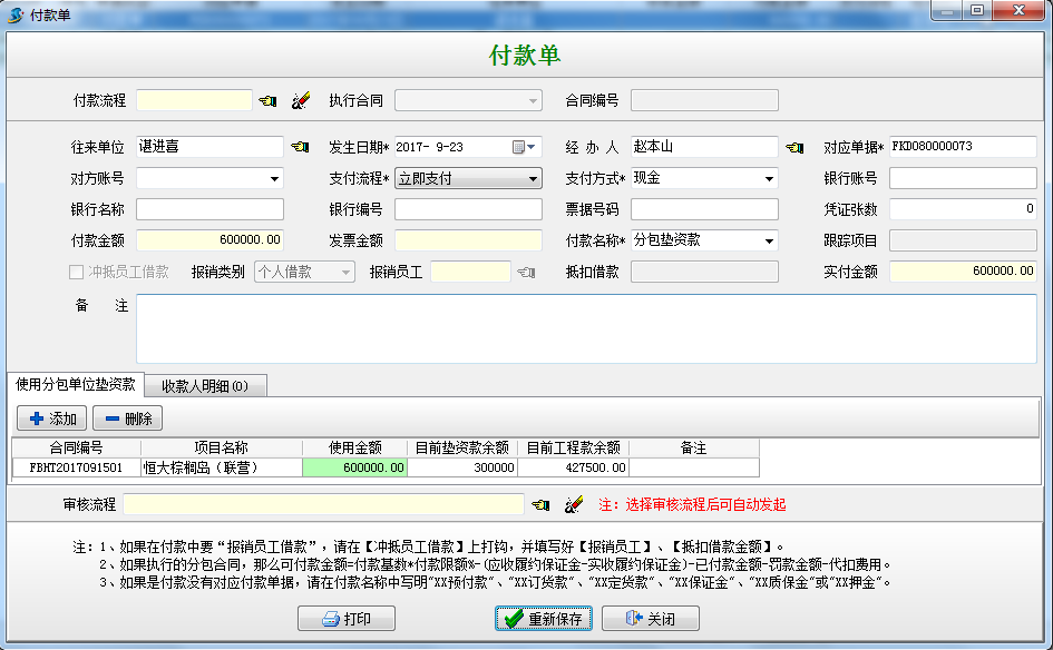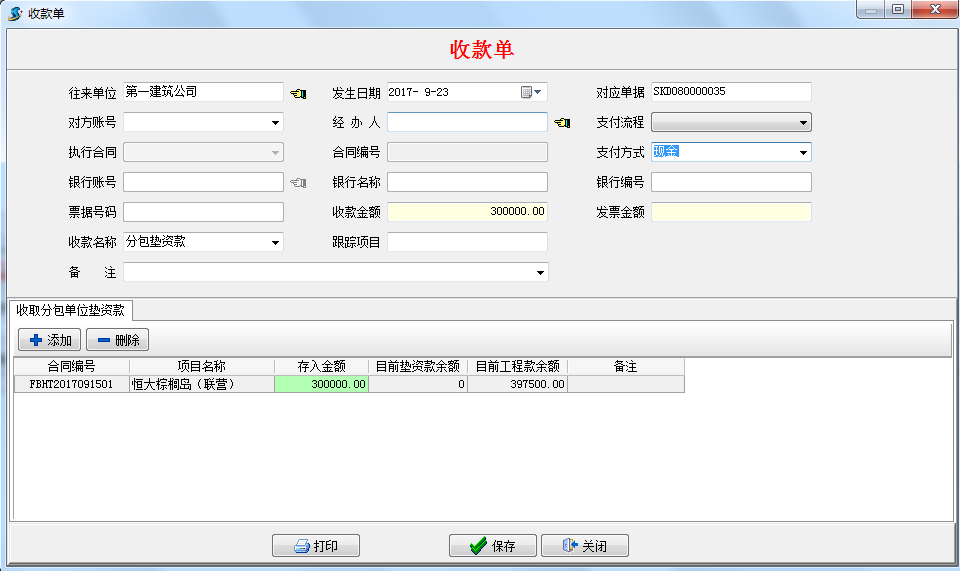 ④“分包合同”→“墊資款記錄”→“執行收款”, 【收款單】墊資款收到(此處的往來單位是掛靠我公司資質的聯營單位)