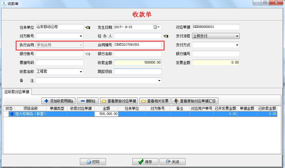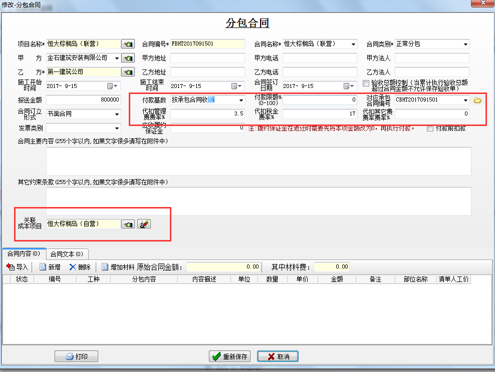 ③“分包合同”“按承包合同收款”,并“對應承包合同編號” “關聯成本項目”(為了查詢發票情況自動匯總和歸屬分類)