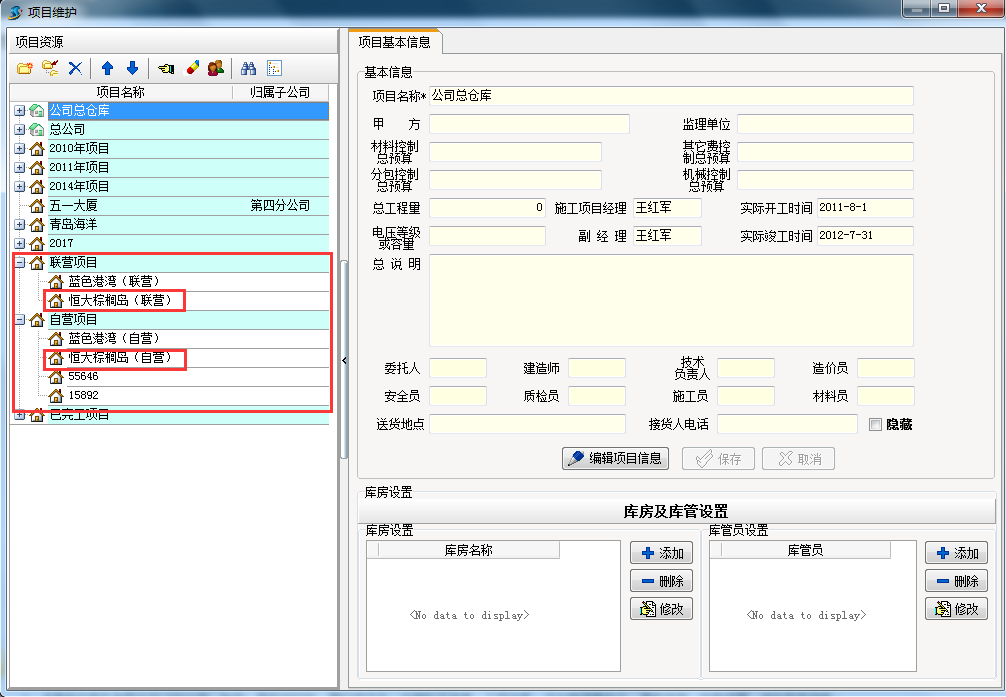 注:首先在項目維護中維護兩個大類(自營項目和聯營項目),兩個大類分別建立項目,其中在“自營項目”中記錄驗收(為了統計掛靠單位成本)和對應發票(為了統計發票歸屬分類)“聯營項目”中只做【財務管理】收付款不做相關的成本業務單據(如下圖)。