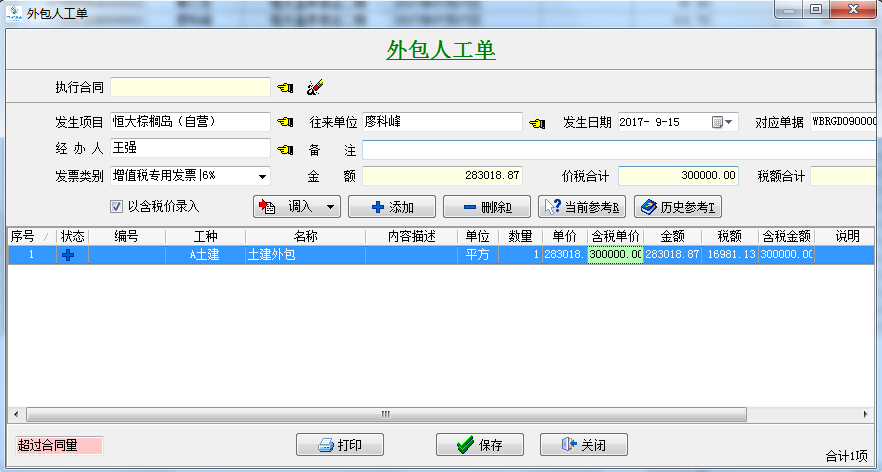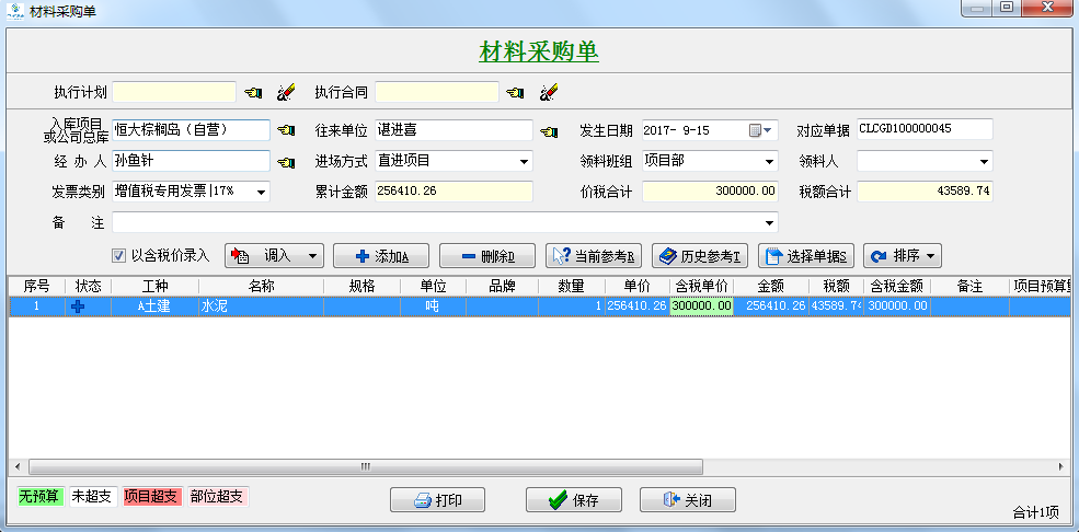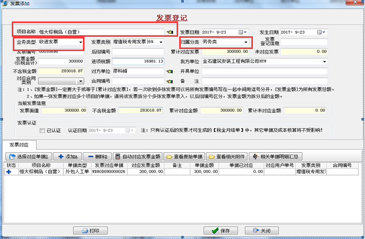 ①在“恒大棕櫚島(自營)”項目下驗收(如有預算先做預算單)【材料采購單】和【外包人工單】各30萬元并對應“進項發票”。
