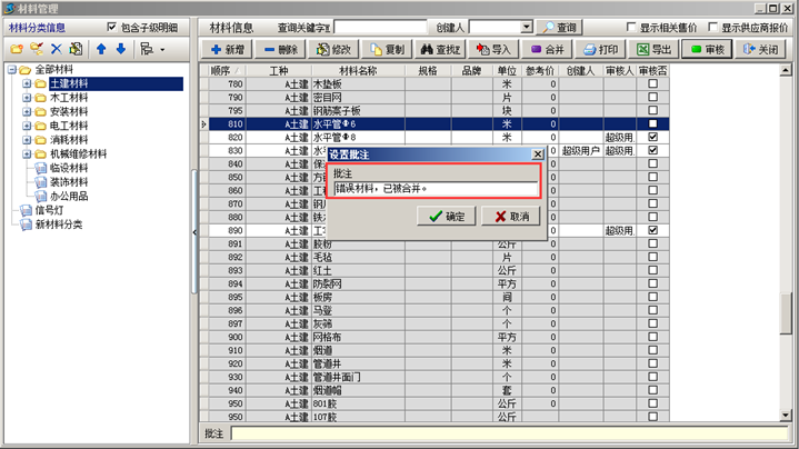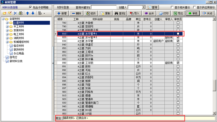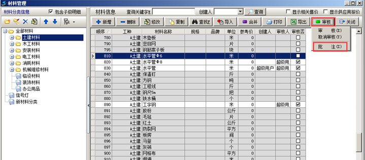 在工地人員使用工程管理軟件錄入業(yè)務(wù)單據(jù)過程中,往往對工程管理軟件的材料庫中維護(hù)員添加的材料不熟悉,已經(jīng)維護(hù)好的材料在工程管理軟件中經(jīng)常找不到,自行添加了材料,但自己添加的材料和維護(hù)員添加的材料名稱差別很大,這樣程序無法識別是否有重復(fù)。此時需要讓維護(hù)員利用工程管理軟件的 【審核提醒】+【事后糾正】+【錯誤批注】 來在過程中指導(dǎo)工地人員的使用,糾正和統(tǒng)一材料的名稱的叫法。