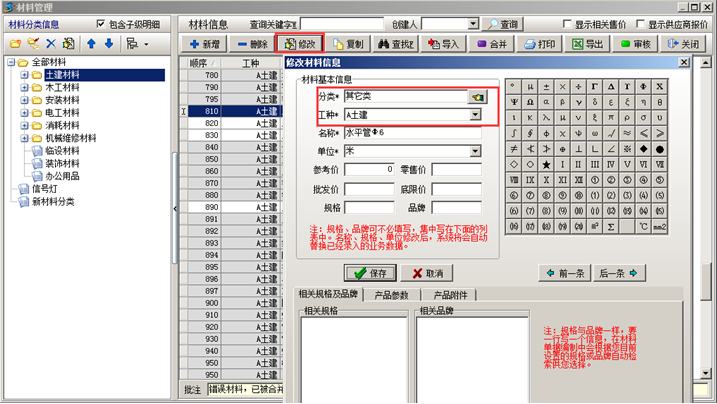 (2) 材料不存在于材料庫中正確的分類下,可以【修改】,把材料調(diào)整至正確的分類下。如圖: