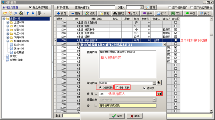 (注:該提醒需要讓做工地上添加新材料的人按F2鍵單獨(dú)給維護(hù)員發(fā)一條信息,也可以開通手機(jī)提醒功能來提醒材料維護(hù)員)