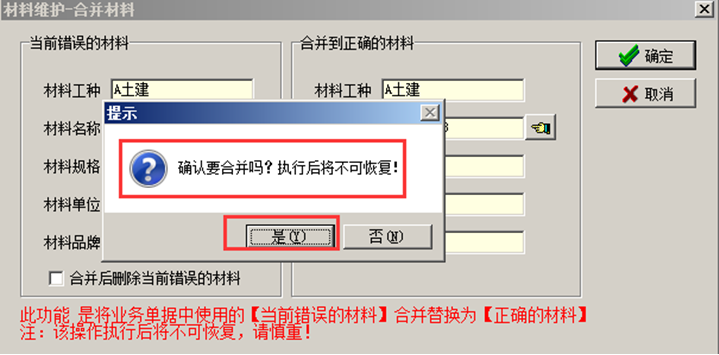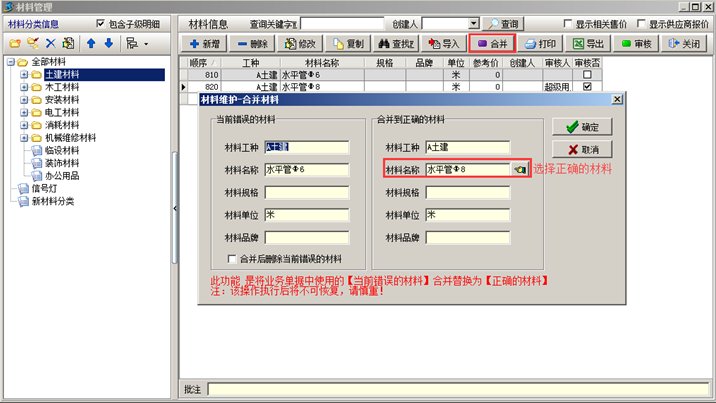 將已經(jīng)存在于工程管理軟件材料庫中的材料進(jìn)行【合并】,選中錯誤的材料,點(diǎn)擊“合并”,在彈出的“合并材料”的對話框中選擇正確的材料名稱,所選擇的材料名稱必須是系統(tǒng)中已經(jīng)審核通過的材料。如圖所示: