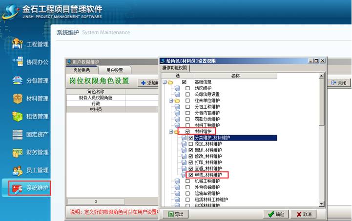 1、首先將 “審核_材料”的功能單獨(dú)分配給材料維護(hù)員一人。在系統(tǒng)中給工作人員分配權(quán)限,如圖所示: