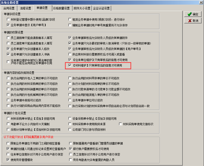 注:如何強(qiáng)制控制新材料使用,可以開啟工程管理軟件的全局開關(guān)【只有審核后的材料才可使用】,此開關(guān)打開之后系統(tǒng)中新添加的材料只有審核通過之后才可以使用,如圖: