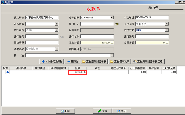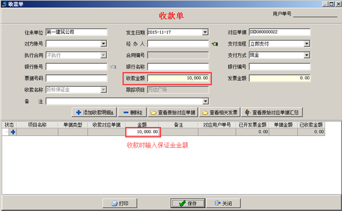 點擊“收到”,填寫收款單,輸入好保證金的金額,如圖: