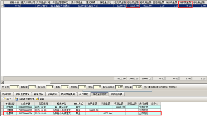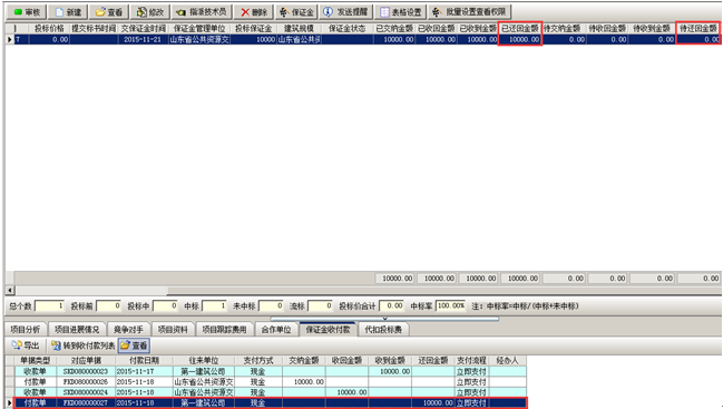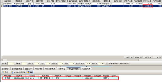 收款完成,工程管理軟件中會顯示已收到金額以及投標保證金的收付款記錄。如圖所示: