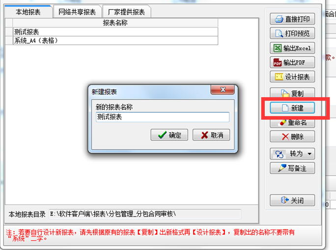 2. 點(diǎn)擊【新建】,輸入報表的名字后確定,再點(diǎn)擊【設(shè)計報表】