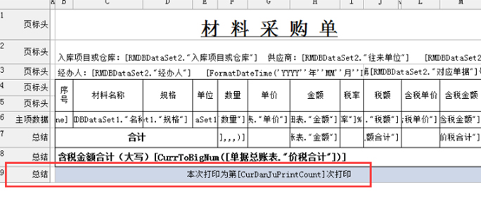 設(shè)置完成后,操作者在生成表格時,可在尾欄插入【數(shù)據(jù)字段】-本次打印為第[CurDanJuPrintCount]打印,示意如下: