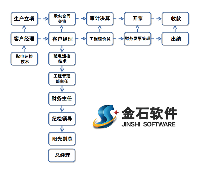 金石軟件工程師通過陽光電力公司相關領導的詳細溝通后,結(jié)合實際情況,對陽光電力管理流程進行了全面的梳理,操作方案流程如下: