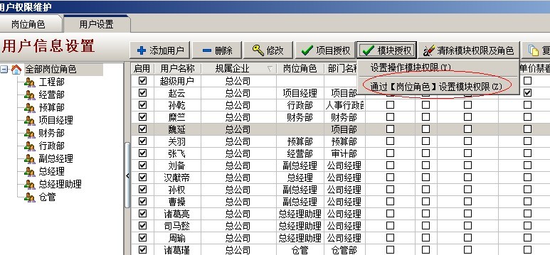回到用戶設(shè)置模塊,選中要授權(quán)的用戶后點(diǎn)擊【模塊授權(quán)】,選第二項(xiàng)【通過(guò)崗位角色設(shè)置模塊權(quán)限】來(lái)對(duì)操作用戶設(shè)置崗位權(quán)限。