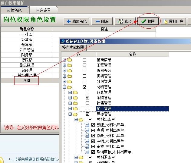 崗位角色權(quán)限設(shè)置完成后,點(diǎn)確定按鈕保存崗位權(quán)限。