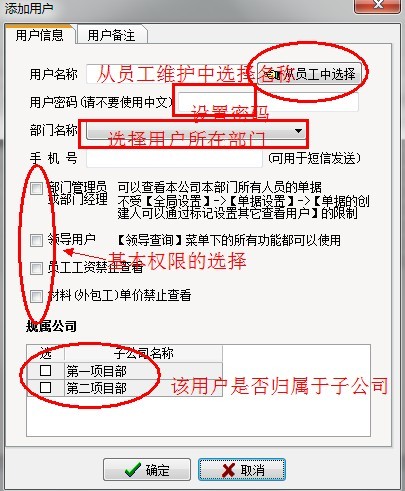 點(diǎn)擊添加用戶,在彈出的窗口中,依次添加好用戶信息,主要包含用戶名、密碼、所屬部門(mén)、所屬公司等。