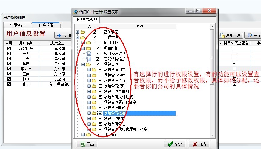 點(diǎn)擊【用戶管理權(quán)限設(shè)置】在彈出的窗口中來(lái)設(shè)置用戶操作權(quán)限。